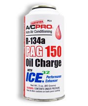 PAG 150 is a high viscosity refrigerant oil for R 134 A automotive air conditioning systems. PAG 150 meets OE specifications and is ISO 150 viscosity. Comes in a easy charge can with a R134 compatible fitting, 2 ounces of PAG 150 oil and a small amount (1 ounce) of R134 A. Always refer to manufacturer specifications before filling. ICE 32 creates a film that seeks out and adheres to metal surfaces. It's polarized and modified molecules power through air-conditioning systems, providing better flow and improved cooling performance. It extends air conditioning system life because it reduces friction which cuts down wear on metal parts and seals, prevents sludge to keep the compressor clean, eliminates moisture preventing oxidation and acid, cuts humidity and drier air improves cabin comfort.